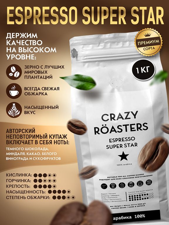 Кофе в зернах ESPRESSO SUPER STAR представляет собой авторский купаж премиальной арабики разных сортов из Центральной и Южной Америки. Основа купажа - это смесь арабики трех стран: Бразилия, Колумбия и Никарагуа. Обжарка: эспрессо (средняя, ближе к тёмной). Плотное, терпкое тело с нотами темного шоколада, миндаля, какао-бобов, белого винограда, орехов и сухофруктов во вкусе. Вкус напитка оптимально сбалансирован, без лишней кислоты и горечи, достаточно крепкий. Идеально подходит для поклонников крепких итальянских смесей для эспрессо, а также для приготовления латте и капучино.