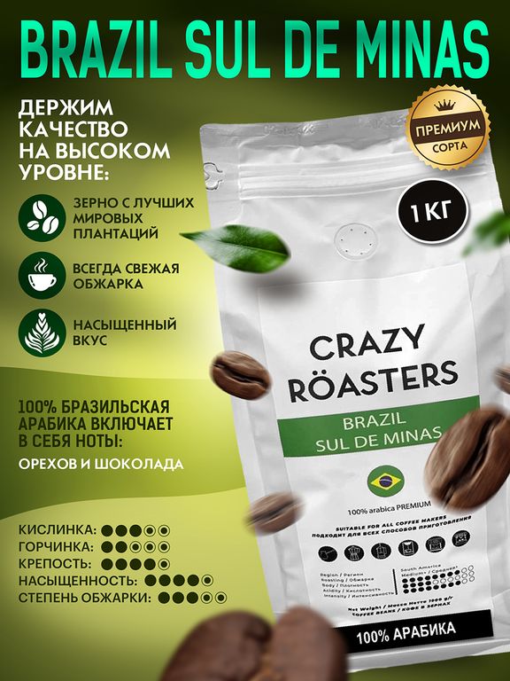 Зерновой кофе Бразилия Сул Де Минас - это изысканный сорт 100% арабики. Считается мировым эталоном кофейного качества. Вкус кофе получается сбалансированным, с умеренной кислотностью, нотами ореха и шоколада, также отличается насыщенным, ароматным вкусом и густой пенкой. Идеально подходит для приготовления бодрящего утреннего эспрессо. Цельные зёрна деликатной ручной сборки, одно к одному, бережная обжарка. Кофе подойдет для рожковых, автоматических кофемашин, для приготовления в гейзерной кофеварке, френч-прессе, для ценителей традиционного приготовления кофе в турке. Кофе по акции/свежеобжаренный кофе/подарок кофе/эспрессо кофе/кофе в зернах 1 кг/1кг/зерновой кофе/кофе зерновой со скидкой/ кофе арабика/зерновой кофе/кофе Бразилия/зерновой кофе 1 кг/кофе зерно.